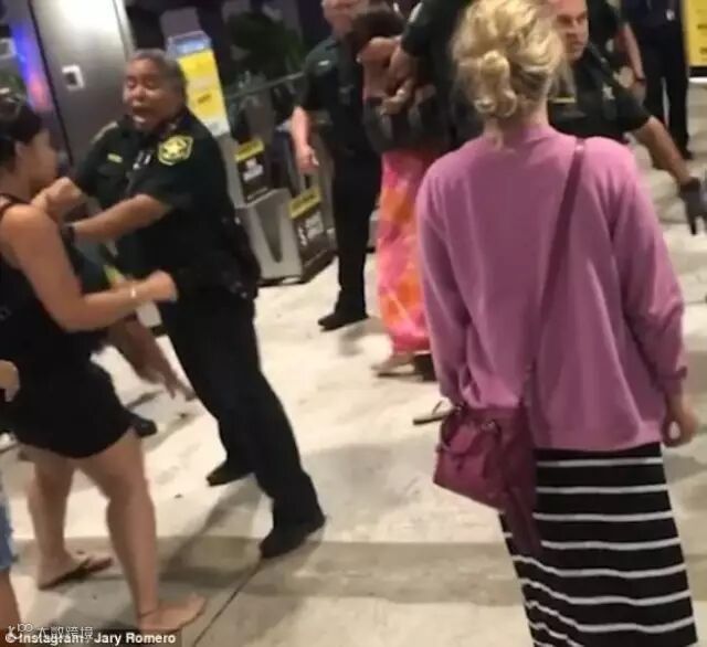 佛罗里达州劳德岱堡机场(Fort Lauderdale)发生航班被取消,导致旅客不满而大闹,机场保安赶维持秩序时,与数名女旅客纠缠搏斗,其中一名女旅客明显被扳倒在地上。