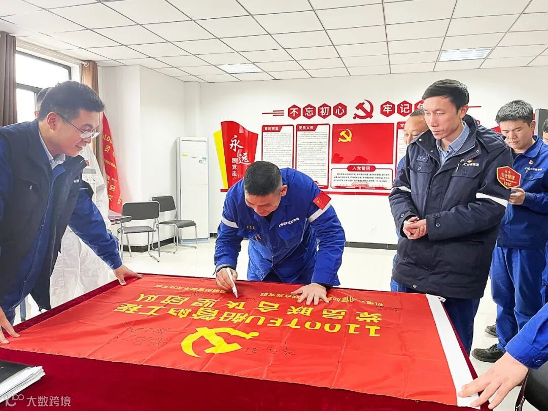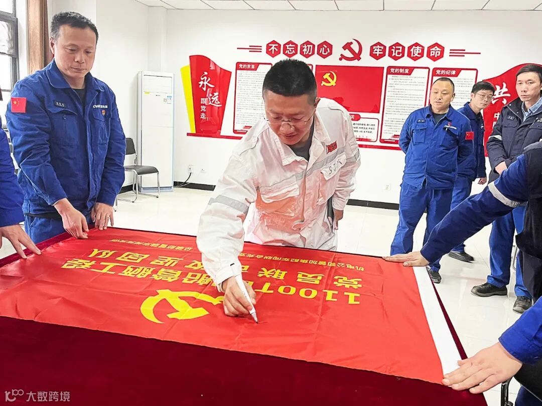 现场还举行了授旗仪式和集体签名活动,生产管理部代表任务牵头方,向双方党支部授予了1100TEU集装箱船管舾工程党员联合攻坚团队队旗,23名攻坚团队成员在队旗上郑重签下了自己的名字。