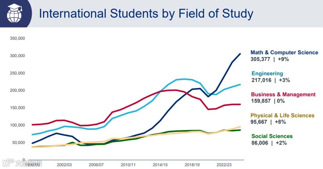 包括中国留学生在内的所有国际学生在专业选择上呈现出更鲜明的趋势:选择 STEM(科学、技术、工程、数学)专业的人数显著增加。数学、计算机、工程等方向的占比持续走高,已经成为中国学生最集中的学科板块。
