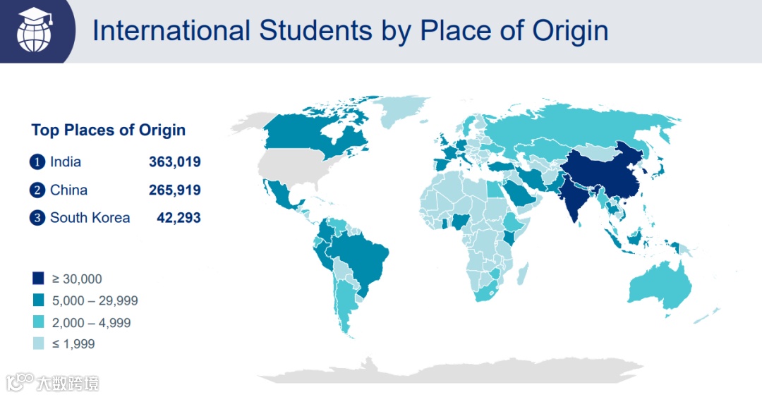 从留学生生源地来看,印度以363,019名留学生稳居榜首,同比去年(331,602人)增长9.5%,占总数的30.8%
