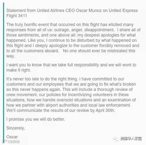 焦头烂额的美联航首席执行官穆尼奥斯周二终于明确道歉,表示“对被强行带走的乘客,和机上所有其他乘客深深致歉。”“我希望你们知道我们将负起全责,我们将努力把事情做对。”
