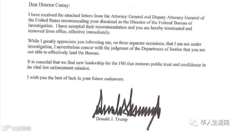 不久之后,他的解雇信被送到FBI华盛顿总部。下图是川普给科米的免职信的全文: