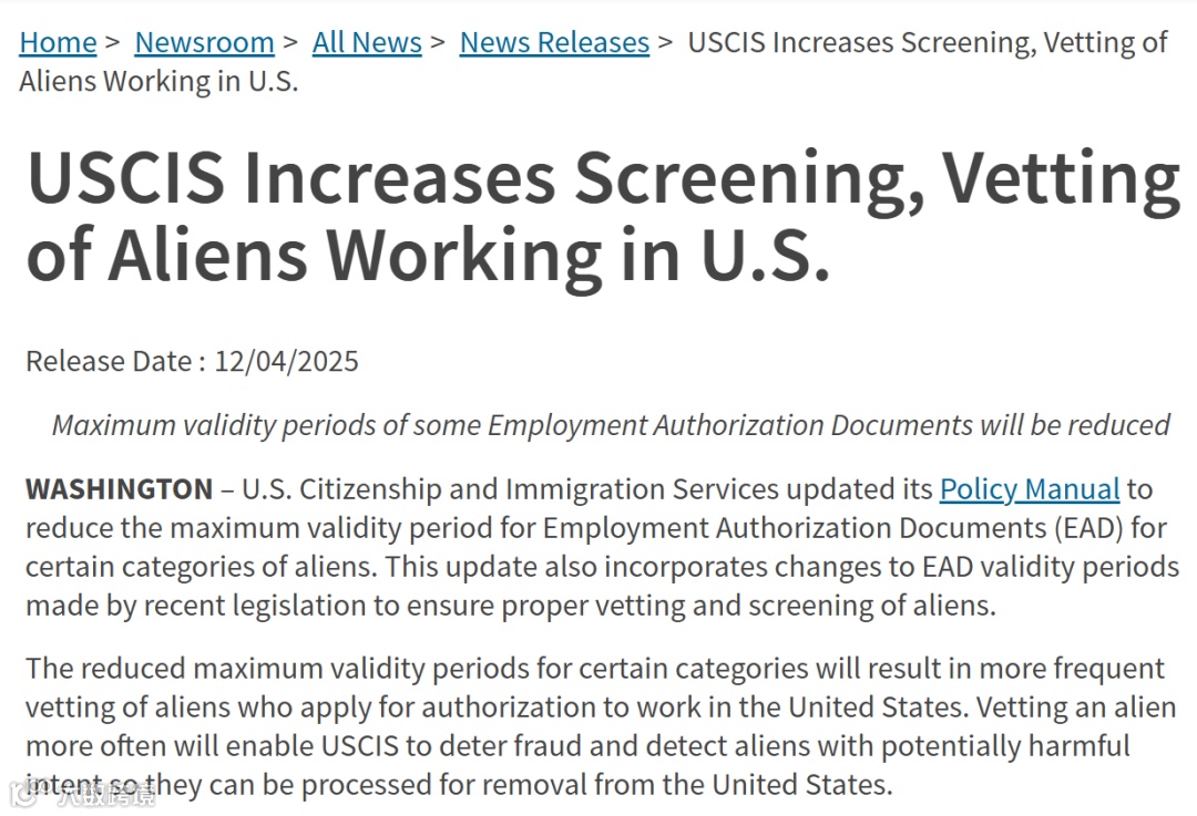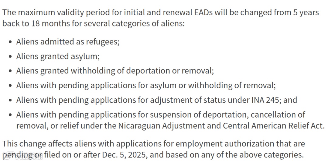也就是现在的政策变化:把拜登的“超长 5 年工卡”取消 → 恢复回 18 个月的正常审查周期。此调整适用于首次申请与续签申请,并自12月5日正式生效。