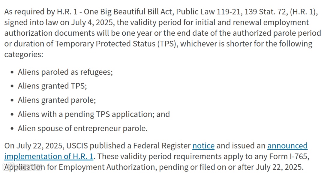 依据2025年7月4日签署的H.R.1法案,以下类别EAD最长只有1年或与授权期限取其最短: