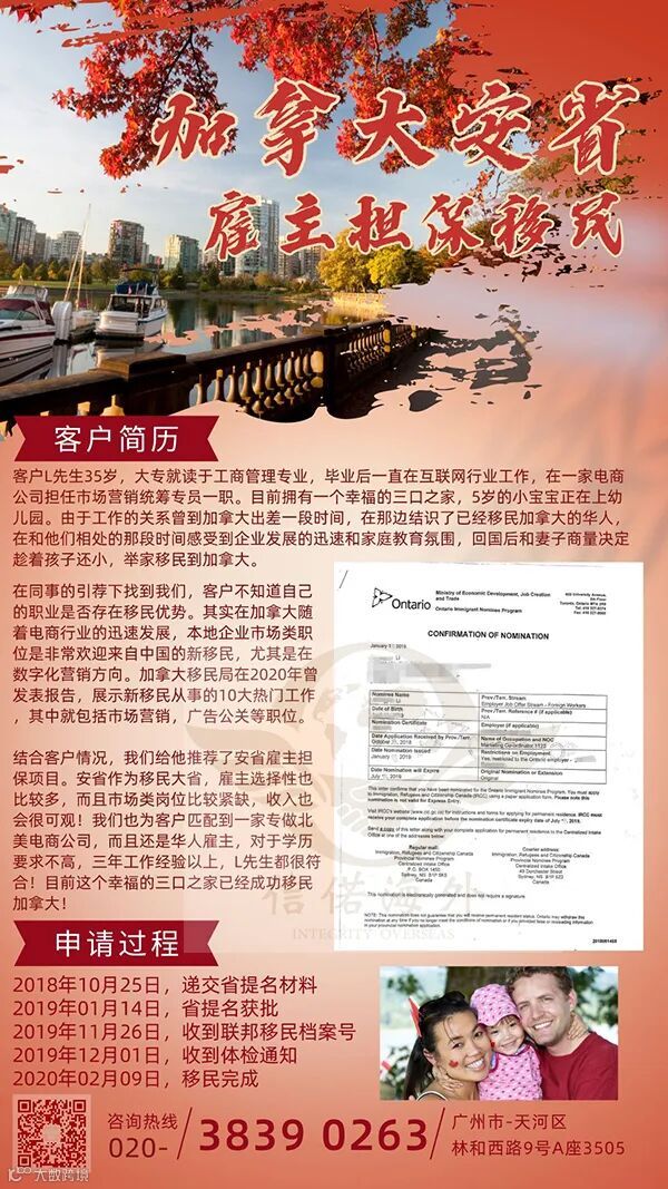 结合客户情况,我们给他推荐了安省雇主担保项目。安省作为移民大省,雇主选择性也比较多,而且市场类岗位比较紧缺,收入也会很可观!我们也为客户匹配到一家专做北美电商公司,而且还是华人雇主,对于学历要求不高,三年工作经验以上,L先生都很符合!目前这个幸福的三口之家已经成功移民加掌大!