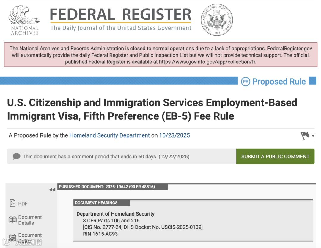 近日,美国国土安全部(DHS)在《联邦公报》正式发布EB-5费用拟议规则(Proposed Rule),覆盖I-526/I-526E、I-829及I-956系列表格的全面降费,同时新增I-527(旧版I-526的修正案)为老投资人提供合规救济路径,并明确处理时限目标与诚信基金惩戒机制。需注意:该规则尚处“拟议”阶段,当前进入60天公众意见期,截止2025年12月22日。