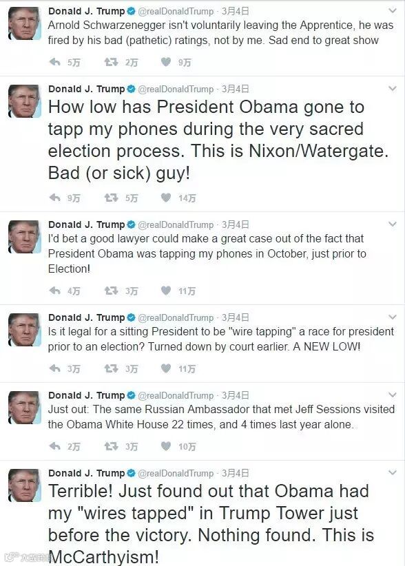 川普最近在推特发布的一系列推文中说:“太可怕了!刚刚发现奥巴马在川普大厦里设置窃听装置。”他同时指控说:“奥巴马太差劲了,在竞选期间窃听我电话?这是尼克松的水门事件的重演。这个坏蛋(有病)!”