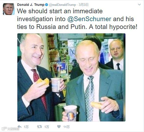 川普早就直指对塞申斯的指控是“政治迫害”。川普3日又在私人推特账号上开炮,贴出舒默和普京的合影称:“我们要立刻调查舒默和俄罗斯以及普京的关系,(舒默)真是个十足的伪君子!”