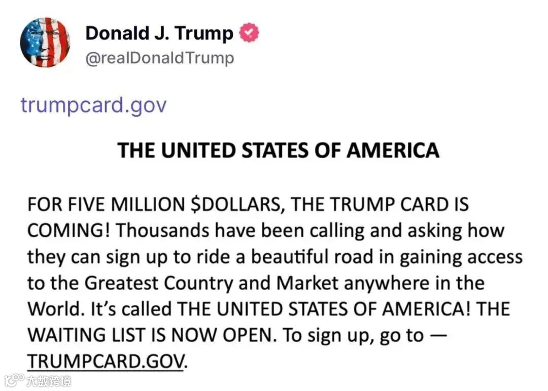 核心卖点:特朗普高调推出定价500万美元的“金卡”(自称“特朗普卡”),宣称其为“类似绿卡但更复杂”的途径,最终可通向美国公民身份。