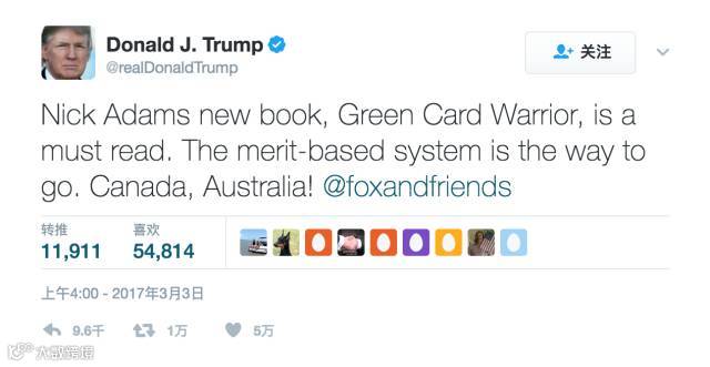 《今日美国》报导,川普周五观看《福克斯与朋友们》(Fox & Friends)新闻节目后,发推文说,亚当斯(Nick Adams)新著《绿卡战士》(Green Card Warrior)是必看的书,“择优制是要走的路,加拿大、澳大利亚!”
