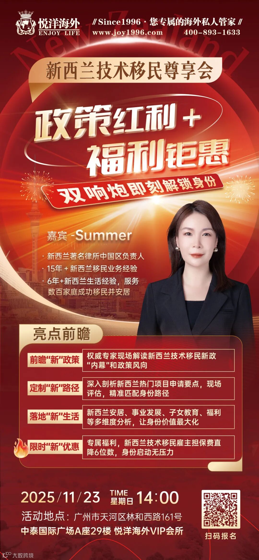 面对复杂多变的新政,您是否需要专业指导?悦洋海外向您发出最诚挚的邀请,相约广州线下的新西兰技术移民尊享会!