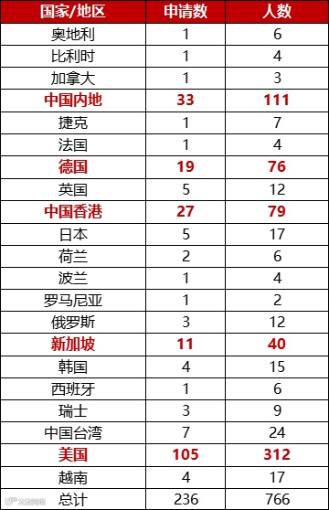 中国:申请量全球第二,60份申请(190人),高净值家庭加速布局;