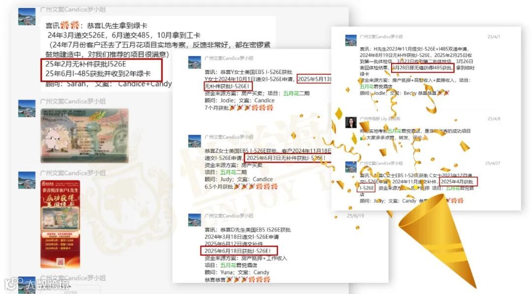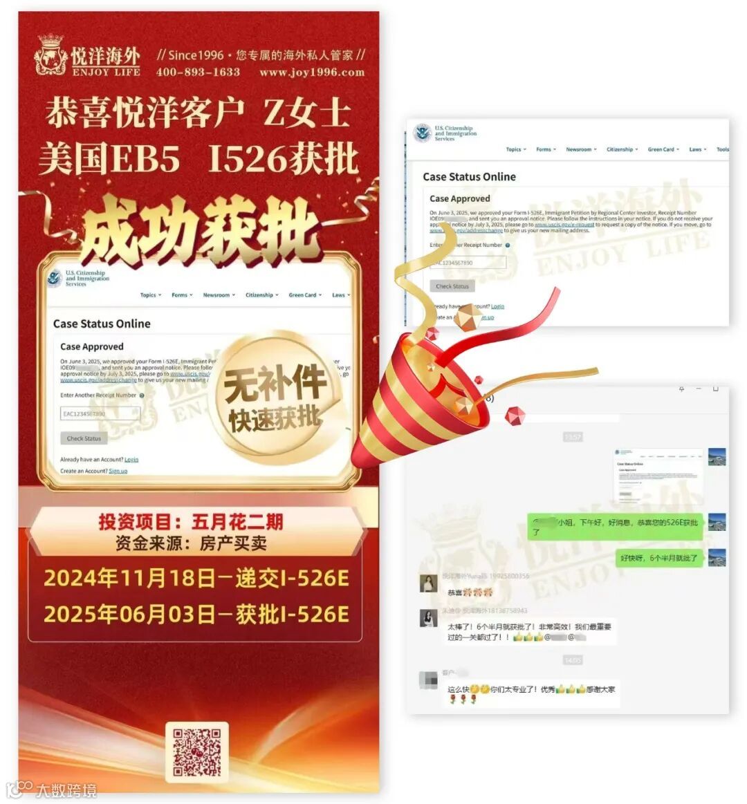 截至今日,五月花项目系列已有82组家庭获批I-526E申请,其中32组家庭已获得临时绿卡!而悦洋的多位客户也纷纷获批!