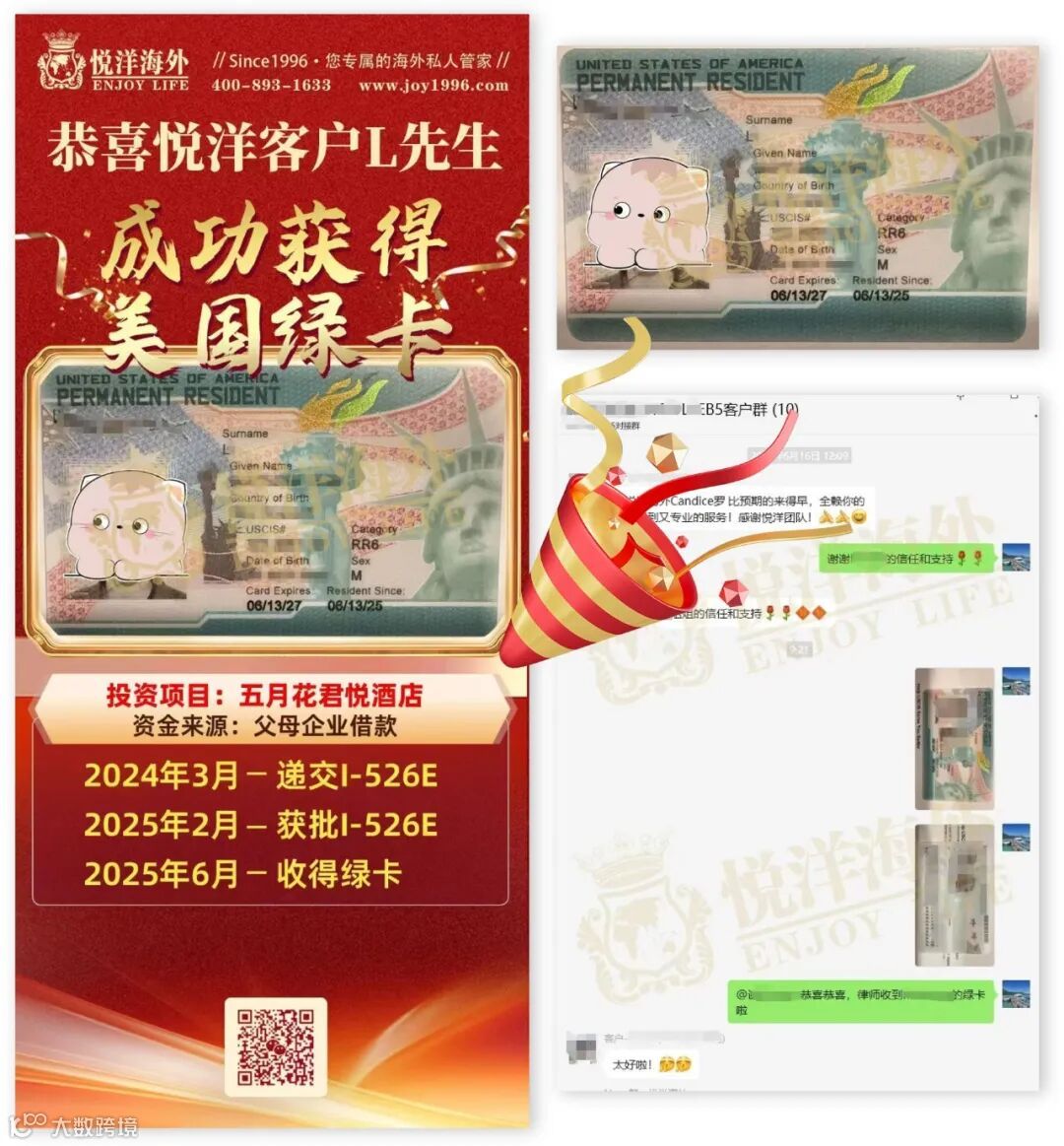 这个项目,目前已有69组家庭获批I-526E申请,其中32组家庭已获得临时绿卡!悦洋近期又有客户通过这个项目拿到了绿卡和I-526。