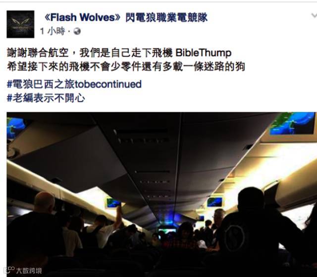 闪电狼职业电竞队今天上午准备搭机前往西巴参加2017 MSI(Mid-Season Invitational,季中邀请赛),但联合航空今早飞旧金山的航班因机械故障而取消,登机後又被赶下飞机,闪电狼在官方脸书贴文「谢谢联合航空,我们是自己走下飞机」。