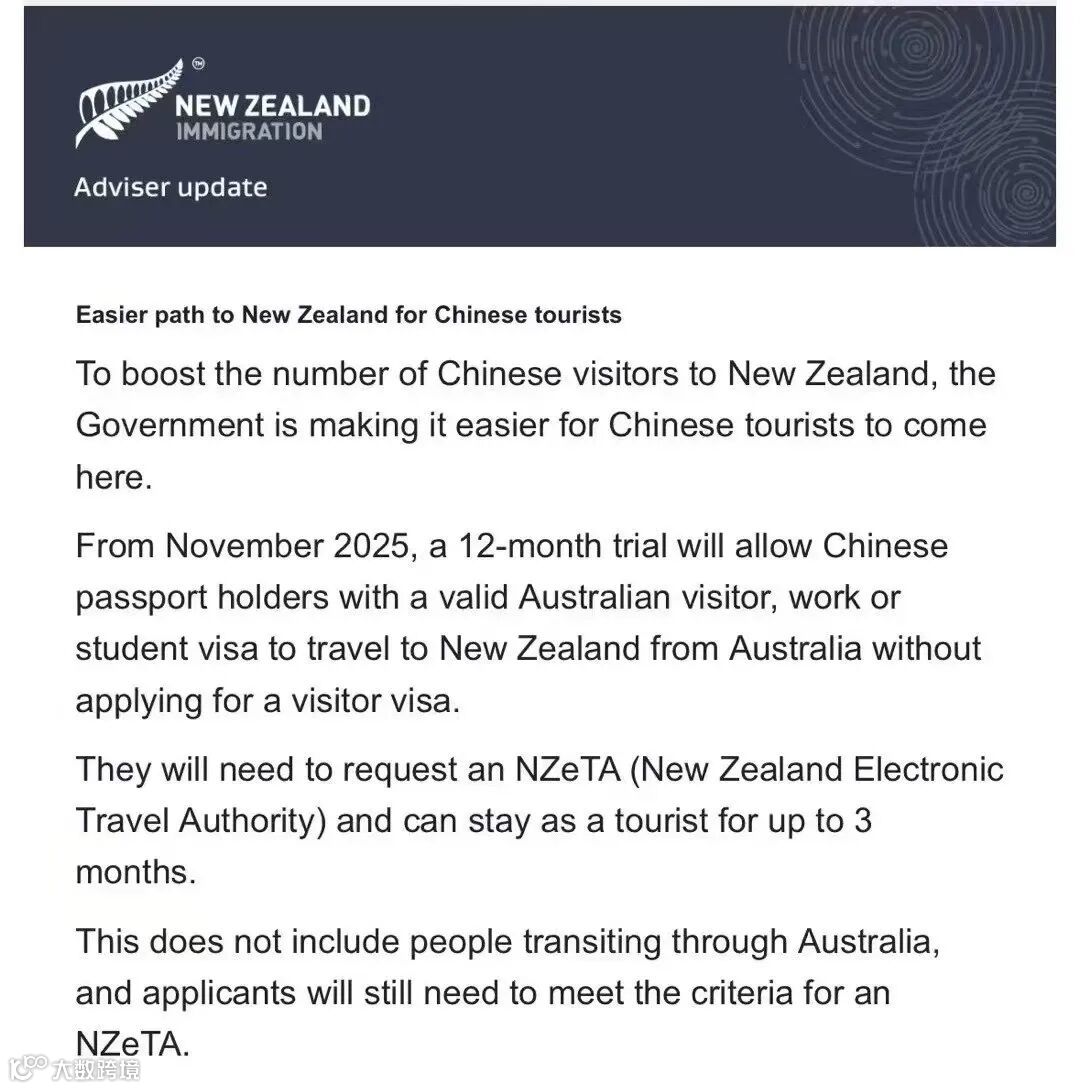 6月15日,新西兰政府官网发布,从2025年11月起,持有有效的澳大利亚签证(旅游签证/工作签证/学生签证等),且从澳大利亚出发进入新西兰可以免签3个月,只需要申请新西兰电子旅行证(NZeTA),NZeTA一般是系统自动批签。此政策试行一年!