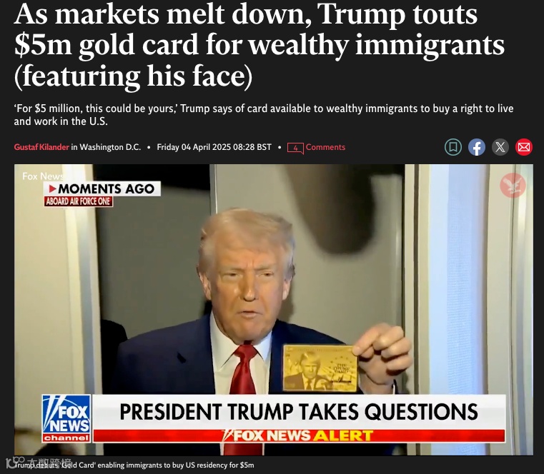 根据外媒《纽约邮报》报导,川普3日在空军一号(Air Force One)上公开展示,他推出的价值500万美元的“金卡签证”最新设计,说明只要花500万美元就能获得这张卡,而他宣布自己就是第一位购买者,尚未确定第二位买家是谁,更指出,预计不用2周时间就会正式推出。