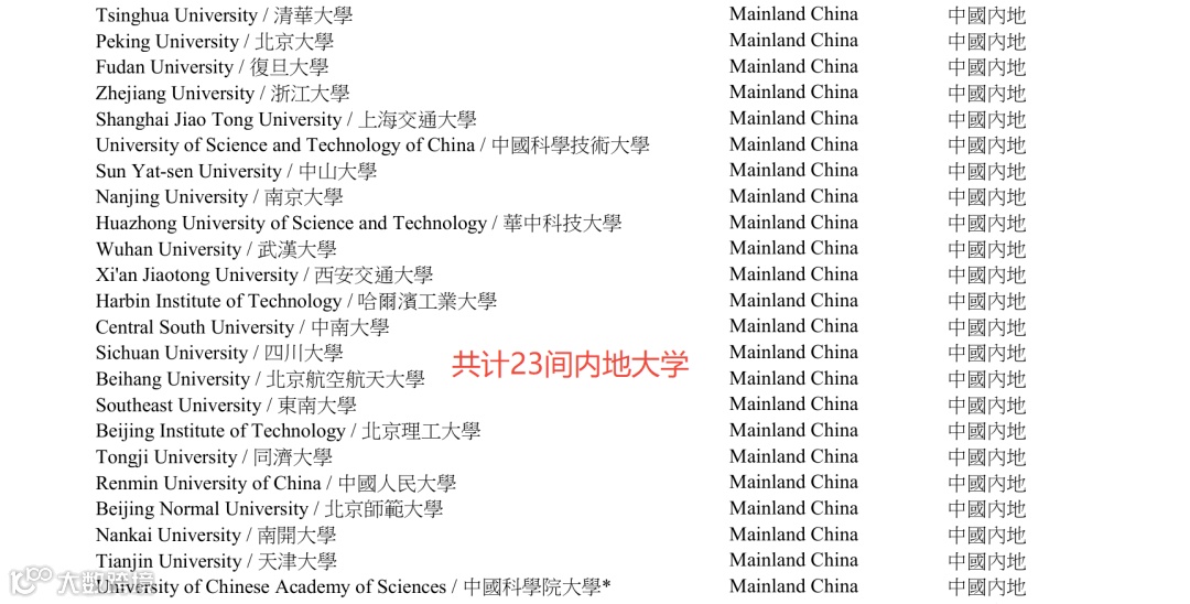 其中,内地合资格大学更是新增至23所!现时内地合资格大学包含:清华大学、北京大学、复旦大学、浙江大学、哈尔滨工业大学、上海交通大学、中国科学技术大学、中山大学、南京大学、华中科技大学、武汉大学、西安交通大学、同济大学、东南大学、天津大学、北京理工大学、南开大学、北京航空航天大学、中国人民大学、北京师范大学、四川大学、中国科学院大学*。