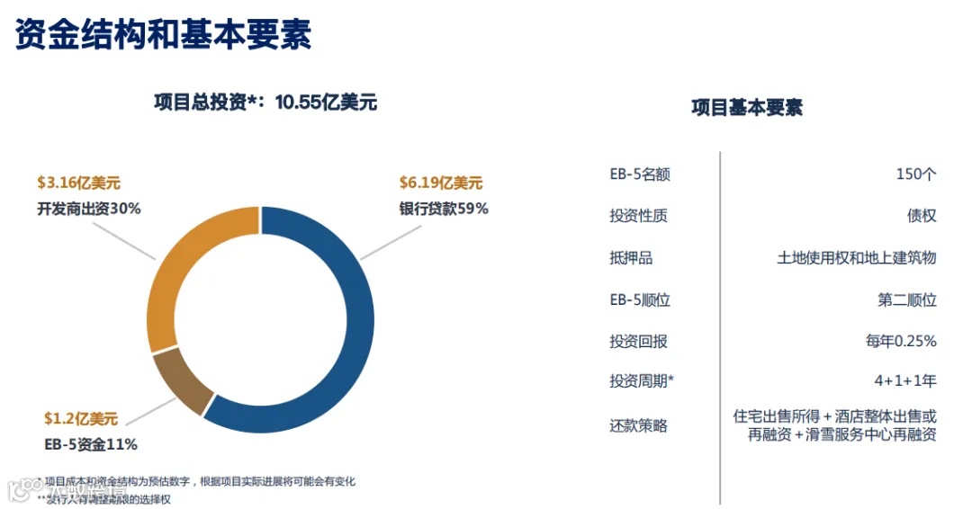 前两期项目已全部售罄,第三期酒店项目毗邻一期项目,位于滑雪场C位,滑进滑出,占据黄金地段,项目整体金额10.55亿美元,EB-5资金占11%,招募150个EB-5名额,预计创造6,106个就业机会,人均就业40.7个!