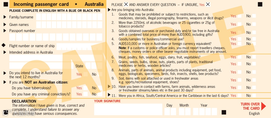旅客向海关工作人员出示护照以及填好的入境卡。工作人员可能会问一些简单问题,比如来澳洲的原因、将待多久、是否有亲戚朋友等。