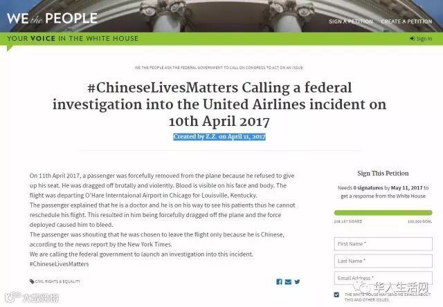 事件发酵当天,一名华人发起了白宫联名请愿#ChineseLivesMatters Calling a federal investigation into the United Airlines incident on 10th April 2017 Created by Z.Z. on April 11, 2017,短短几天签名人数超过20万人次后,已经有208,157 人签名。
