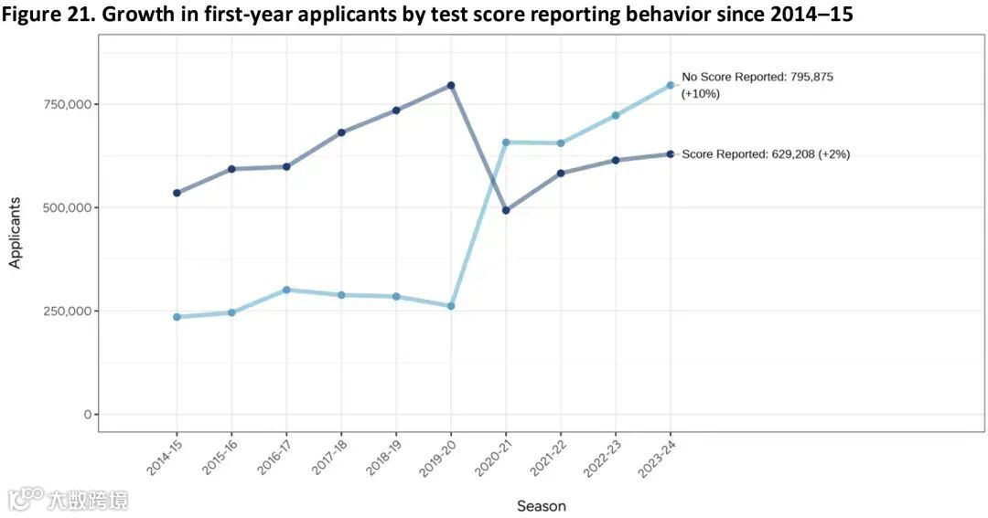 近年来,选择提交标化分数的早申请学生比例分别为78%(2019-2020)、44%(2020-2021)、48%(2021-2022)和47%(2022-2023)。本申请季,未提交和提交标化的学生人数分别增加10%和3%。