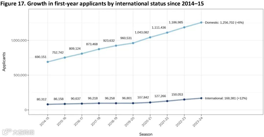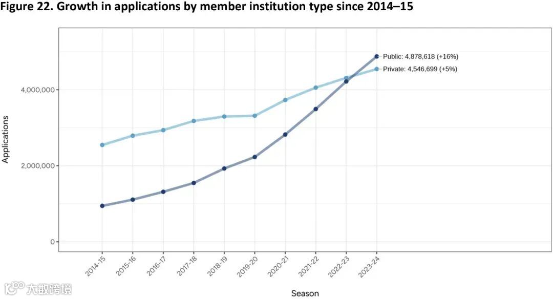 本申请季,公立院校申请量(4,878,618)首次超过私立院校(4,546,699),反映了过去数年公立院校受欢迎程度不断上升的趋势。相比2022-23申请季,公立院校申请量增幅(+16%)远超私立院校增幅(+5%)。