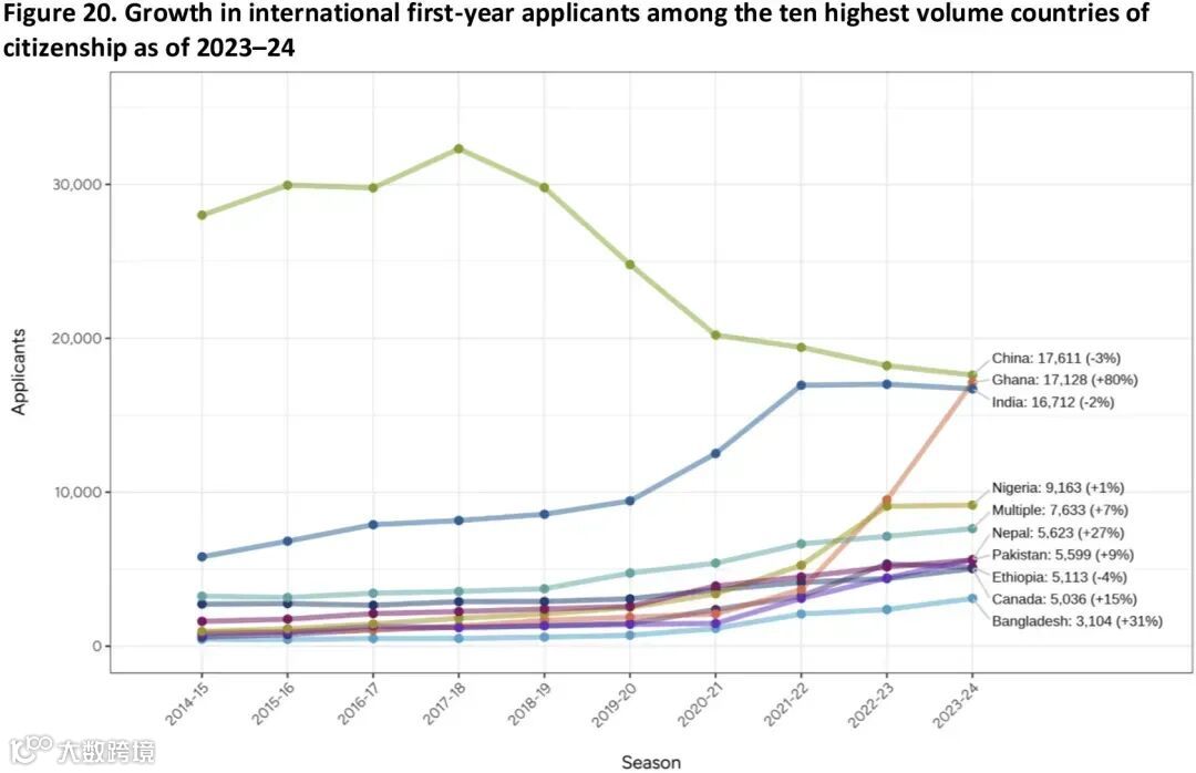 过去十个申请季变化趋势前五大国际生源国依次为中国、加纳、印度、尼日利亚和尼泊尔。虽然本申请季勉强保住平台国际生榜首位置,但中国生源连续六年走低,人数相比2017-18年的峰值近乎腰斩!