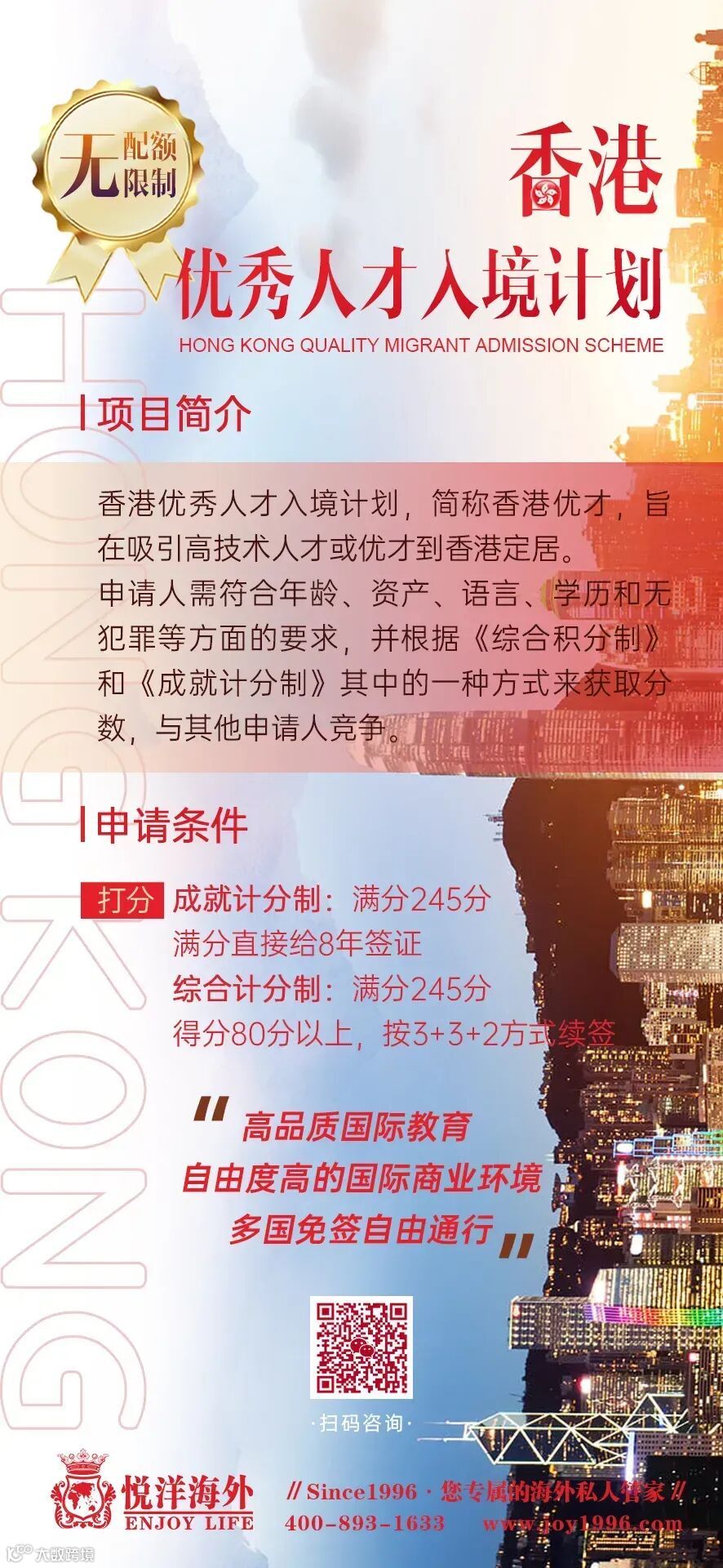 综合计分制更适合大部分人,需要通过综合积分制通道,基本对申请人年龄,工作经验,学历,语言,家庭背景等方面进行评分,其总分为245分,满足80分以上可以递交香港优才计划申请