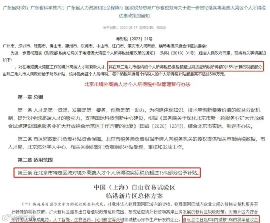针对在大湾区/北京/上海的特定区域内工作的境外高端人才,政府都设立了个人所得税优惠落地政策。比如在大湾区工作的境外高端人才,其缴纳的个人所得税超过其应纳税所得额15%的部分,会由政府进行财政补贴,且该补贴免征个人所得税。