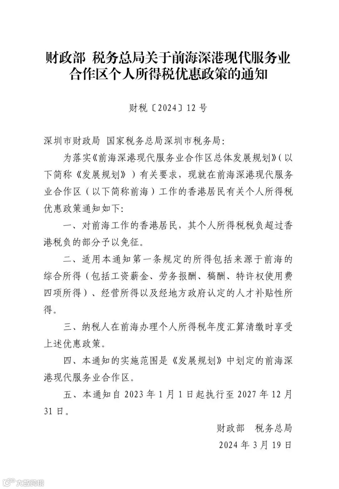 深圳前海税收优惠政策正式宣布迎来新利好:对在前海工作的香港居民,其个人所得税税负超过香港税负的部分予以免征!!