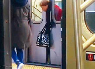 一名女子在布朗士地铁月台遭列车的车门夹头,但旁边的冷漠乘客却似乎不以為然。