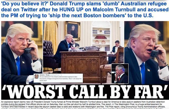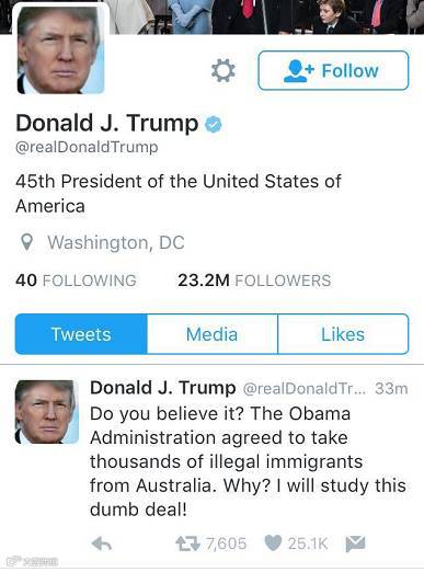 “你信么?奥巴马那一班人竟同意把几千非法难民从澳大利亚手里接到美国手里,凭啥?!我得好好研究一下这个愚蠢的交易!”