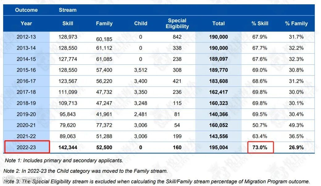 2022-23财年移民涨幅非常大!技术移民增长了73%,创造了十年来的蕞高数据,但家庭移民则增长了26.9%,为十年来的新低。
