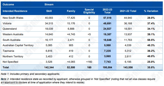 2022-23财年澳洲移民中,各类别获批数据分别是: