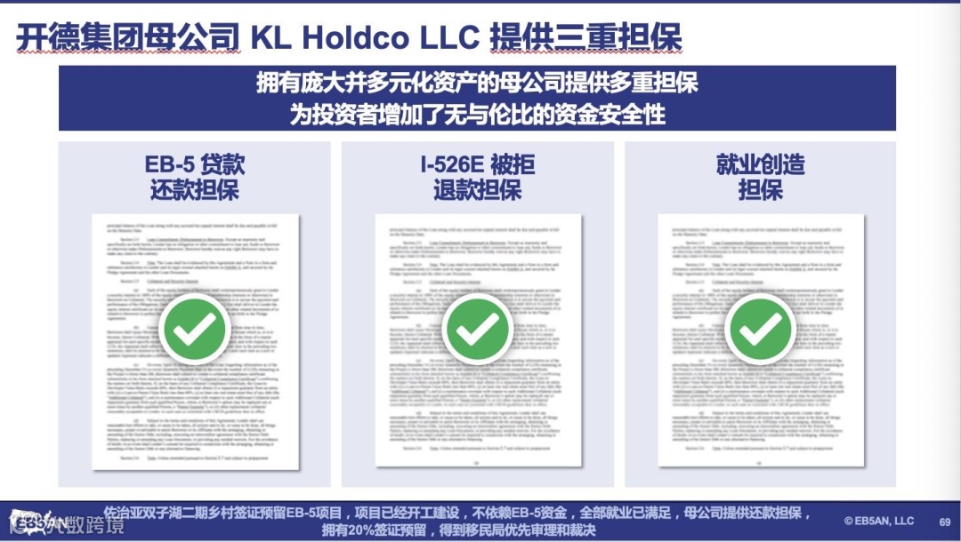 开德集团为EB-5投资者提供三重担保:EB-5还款担保、I-526E被拒退款担保以及就业创造担保。拥有庞大多元化资产的母公司提供多重担保为投资者增加了无与伦比的资金安全性。