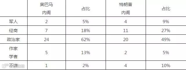 政客占比跌破50% 从原职务看,观海解局(ID:guanhaijieju)记者发现,川普内阁政客占比降低,商人和军人的比重增加。政治家占比从奥巴马时期的62%,降至49%。相比之下,军人和商人两者占比从奥巴马时期的23%,增加到36%。早在1月6日,人民网报道称,川普自2016年11月赢得美国总统大选胜利以来,一直在紧锣密鼓地挑选和敲定将与他亲密共事的成员,组建自己的内阁及执政团队。在他已经宣布的人选中,有的和他一样,是没有太多执政经验的商界大腕;还有几位是退役将军。有的人选是充满争议的人物;也有的人选是众望所归。内阁成员还要等待参议院的听证会审议通过,而也有很多关键职位则完全依赖总统的钦点。对此,新加坡《联合早报》此前刊文称,川普新政府的重要任命渐次公布,大部分人在政策经验方面几乎是空白,他似乎坚信公共政策方面的专业技能并不重要。获得提名为财政部长的姆钦不是任何一家政策机构的委员,也没有证据显示他坐镇过布鲁金斯学会、美国企业研究所或华盛顿其他任何经济政策讨论机构的专家组。美国AEI的经济政策专家韦乌格说,“我从来没听说过他”。自姆钦成为财政部掌舵人选以来,这是华盛顿政策人士经常发出的一句评论。姆钦的任命只是川普在组建自己的内阁时反复出现的一个主题的一部分。川普任命的大部分人在直接相关的政策经验方面几乎都是空白。从未在任何级别的政府担任职务的川普提名的白宫办公厅主任赖因斯·普里巴斯和白宫首席策略师班农都和其情况相同。不过,也有例外,如提名众议员普锐斯领导卫生和公众服务部,提名前劳工部长赵小兰担任交通部长。这些人选按照常规来看是有资格的。《纽约时报》分析指出,从目前总的任命情况来看,川普似乎打赌认为,管理政府机构和应对公共政策的技术细节难题的具体经验根本不重要。当然,外来者可能会动摇僵硬的官僚体制,带来新的视角。不管你对罗斯的贸易观点怎么看,源自其多年的全球商业经验,并且肯定会带领商务部走向新的方向。未来几年里,这将是一个吸引人的实验过程,它将验证政策专业知识对有效的政府运作究竟有多重要。内阁成员原职务分布