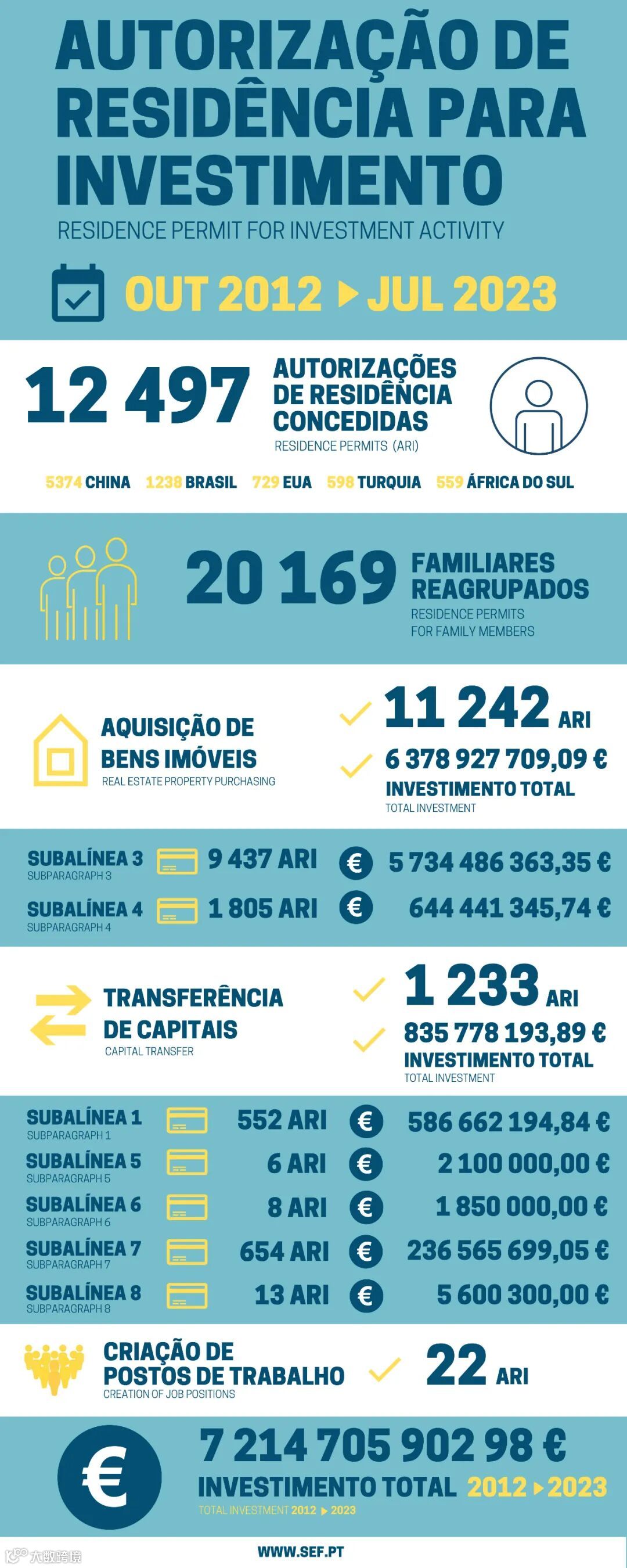 葡萄牙黄金居留签证是2012年推出的一项投资移民计划,根据7月葡萄牙移民局(SEF)数据统计,截至2023年7月——