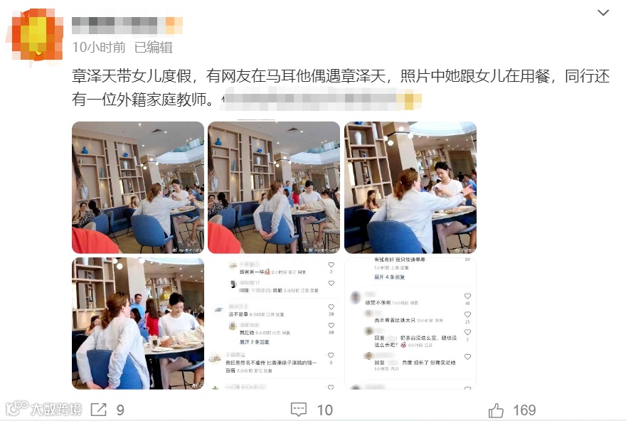 在上面的图片中,还可以看到一位外国人,细心照料孩子。爆料博主有在评论区回复证实,这个年轻的卷发白人女士正是“奶茶妹妹”请来专门教导女儿的家庭教师,不仅可以照顾孩子生活,还能够教孩子英语。
