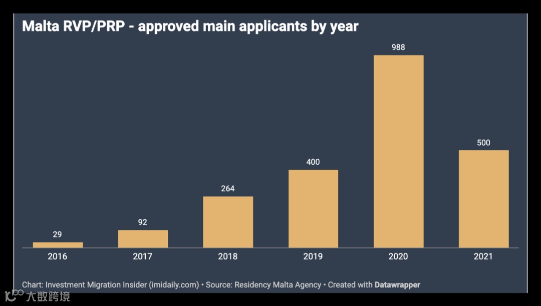 根据马耳他移民局的数据,从2016年到2021年年底,一共有2273名主申请人及5303名附属申请人通过投资移民获得了马耳他永久居留身份。