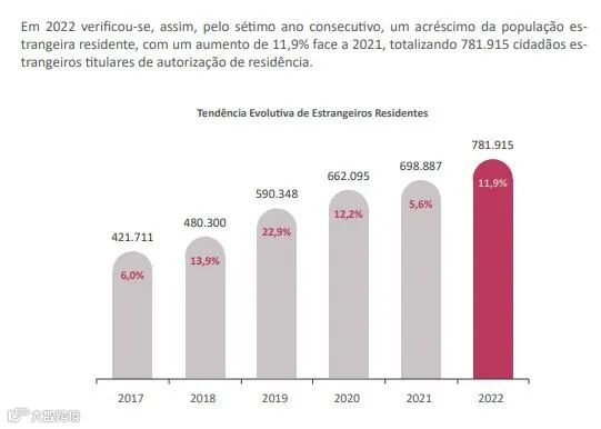作为欧洲近年特受欢迎的移民政策之一,葡萄牙黄金签证从来都是移民市场上的明星存在。在《移民、边境和庇护报告》(RIFA)称,“2022年,外国常住人口连续第七年增加,与2021年相比增加了11.9%,共有781,915名外国公民持有居留证”。