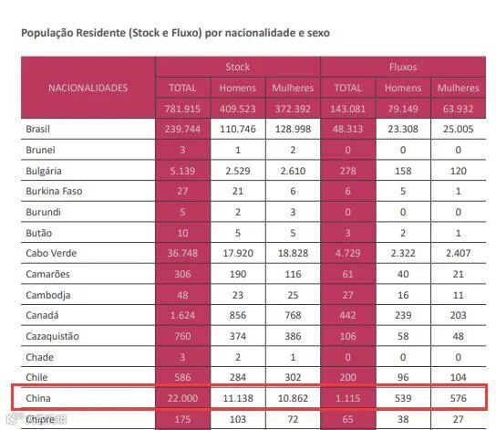 其中在葡萄牙中国籍移民人数有22,000人,男性11,138人,女性10,862人。