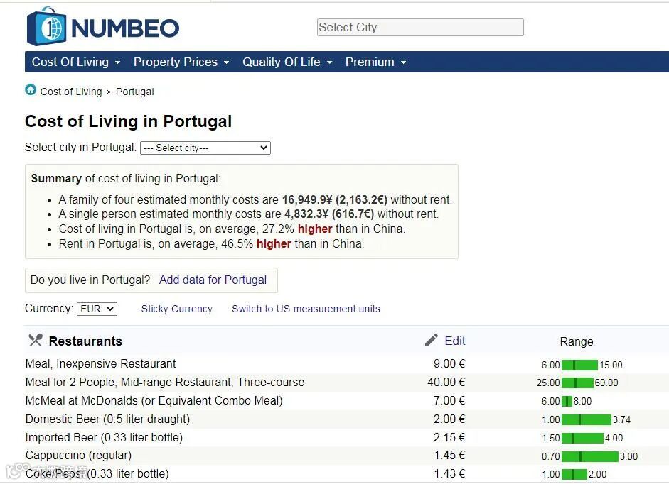 (来源NUMBEO网站https://www.numbeo.com/cost-of-living/country_result.jsp?country=Portugal)