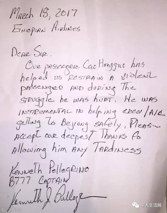 此时,曹红国心里的大石头落了地,恍然间才发觉脸上火辣辣的,原来在搏斗中他鼻梁和脸颊被擦伤了;头也隐隐作痛,不知道被歹徒手里大玻璃杯砸的,还是过程中撞的。正当挂了彩的他琢磨着怎么跟同事、家人解释、报平安时,处理完交接事务的埃航机长特意赶过来致谢,机长紧紧握着他的手,对他勇斗歹徒的义举表达万分敬意和感谢,并亲自写了一封感谢信。