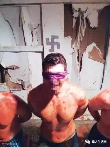 此外,第三张照片还显示了一名男子被蒙住双眼,跪在一个双十字的法西斯符号前,浑身被涂满了辣酱。