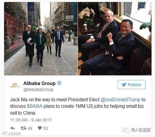 美国时间周一早上,美国总统当选人川普在纽约会晤阿里巴巴创办人兼执行董事马云后说,他们的“会面良好(great meeting)”,马云则表示,在未来五年将为美国创造一百万个新的就业机会。