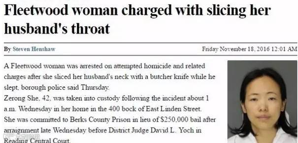 不要养小三,王丹出轨算是幸运的,说了不听,华男有小三,差点脑袋被砍掉。据readingeagle网站消息,周三凌晨1点,42岁的华裔女子佘泽蓉(Zerong She,音译)趁丈夫熟睡之际用菜刀砍伤其颈部,由于临时心软,最终并未下死手,而是在割伤丈夫之后报警。