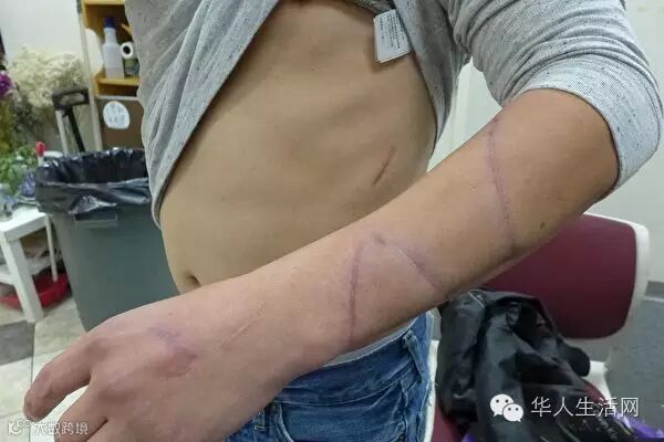 随后气急败坏的邱光俤提起砍肉刀,便向王先生迎头砍去。“我当时特别害怕,第一反应就是用手护住我的头。随后感觉一阵有一阵钻心的疼痛,再定睛一看发现血从我手上喷涌而出。”王先生表示。 受害人展示身上多处触目惊心的刀伤。