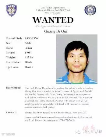 经过医院抢救,王先生保住了性命。但是近10处的刀伤则给王先生带来了极大的痛苦,“因为左臂的筋断了,因此我现在手指都没有办法动。光是治疗就花了5万,现在不仅厨师做不了,养家糊口都成了问题。现在没办法工作,都不知道未来怎么办。”王先生无奈地表示。 新泽西州洛蒂市警察局出具的通缉令。