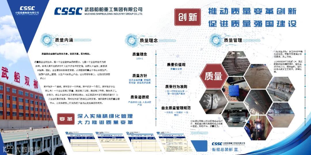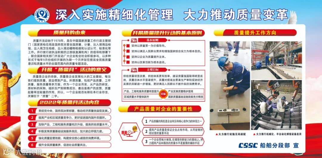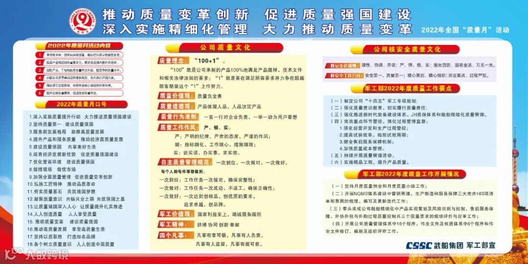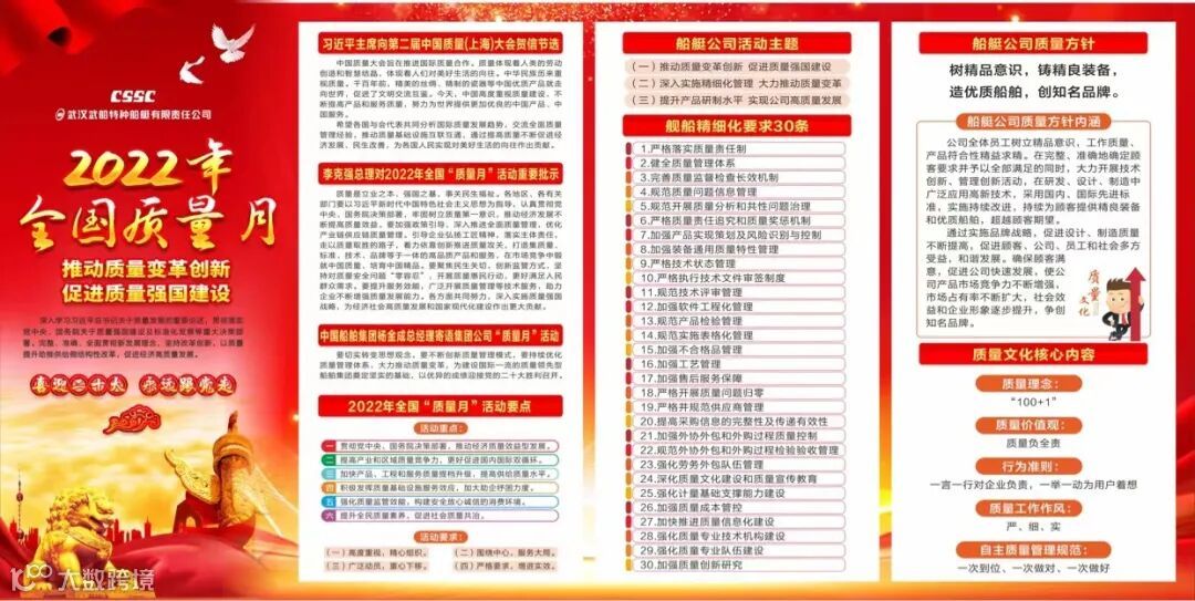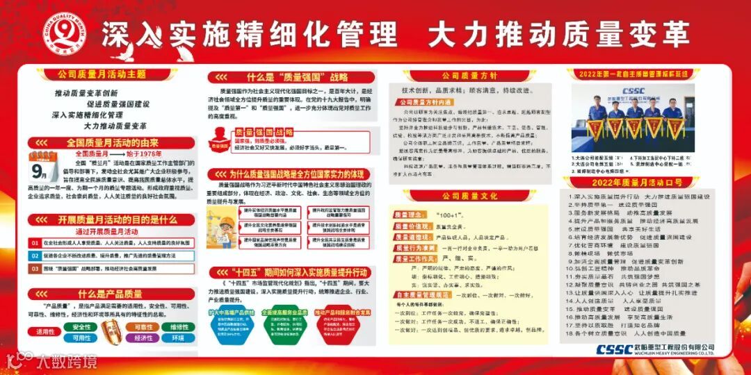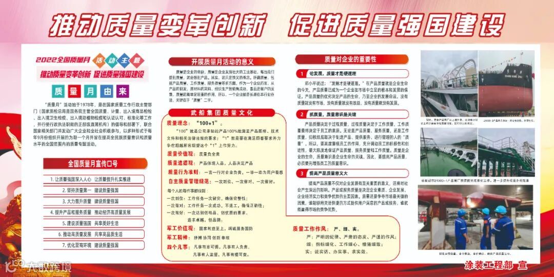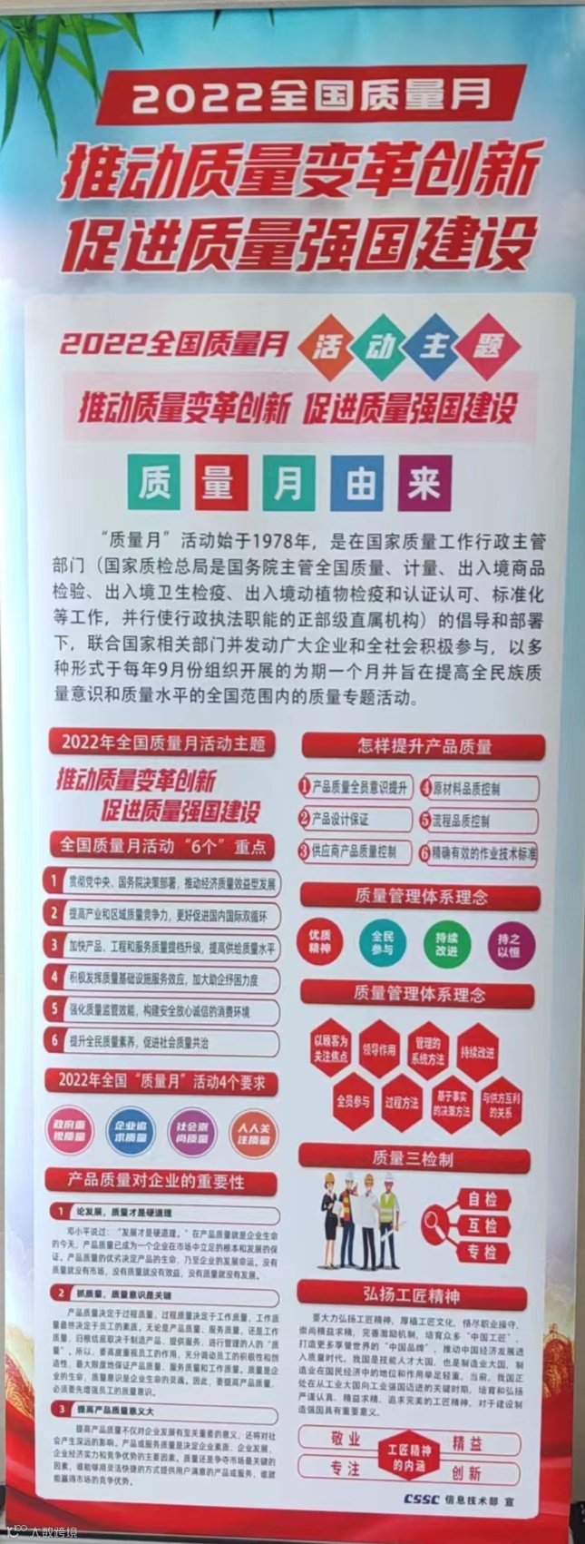 9月,中国船舶武船启动了第45个全国质量月活动。活动期间,公司各单位积极组织参与,结合本年度质量月口号、公司质量文化、核安全文化、质量典型案例、质量工作先进经验和优秀事迹等制作了质量宣传展板,营造了良好的质量氛围。